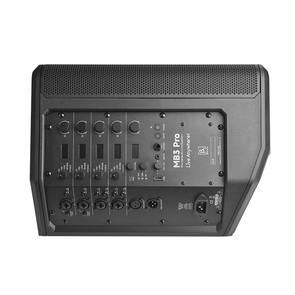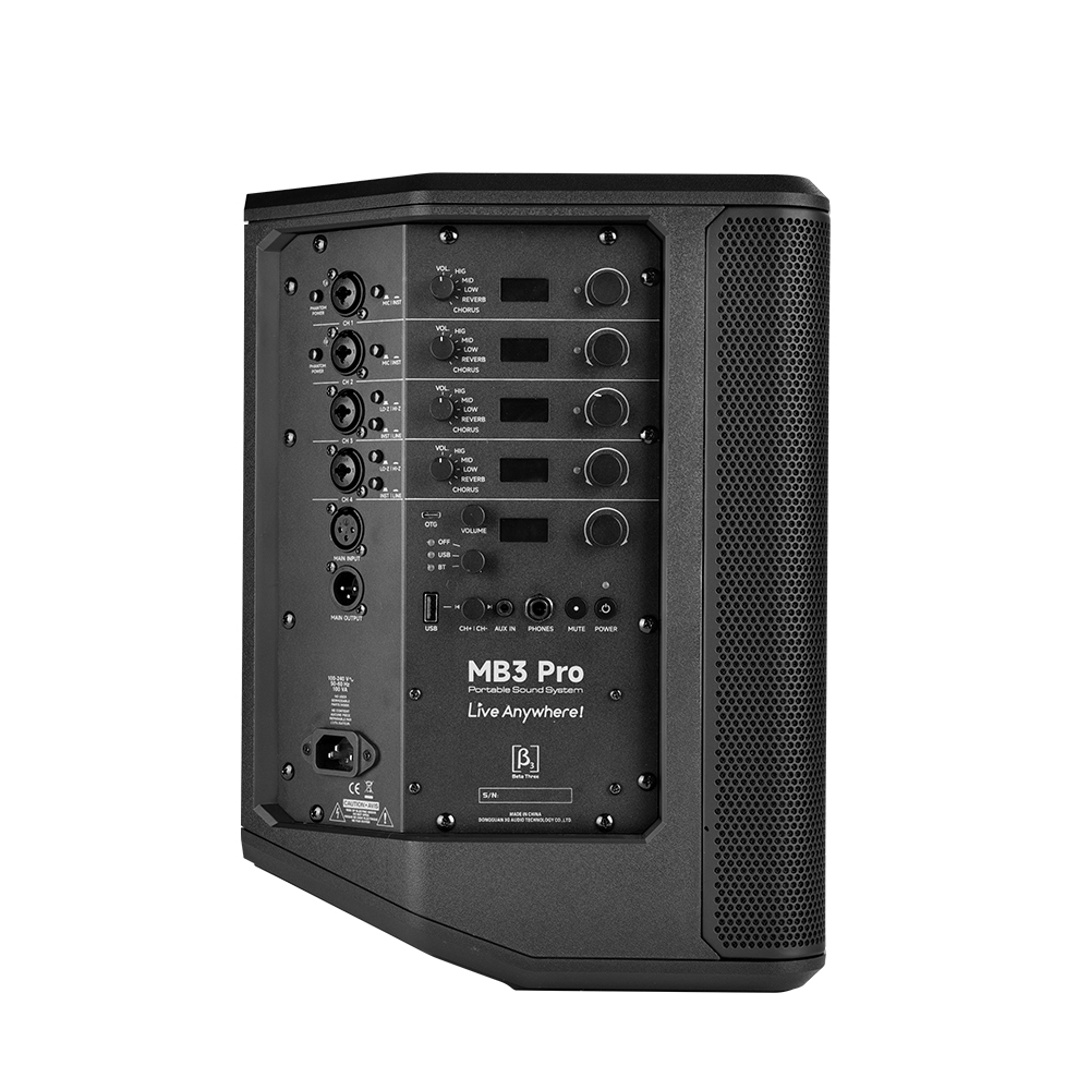 MB3 Pro配备了一个8英寸低音扬声器和一个5英寸加1英寸的同轴中高音扬声器,采用自主研发的有源三分频技术,使其带来强劲的低频体验同时也兼顾卓越的中高音的表现。其内置的四通道混音面板让音乐表演更多可能,助力用户轻松完成音乐表演。